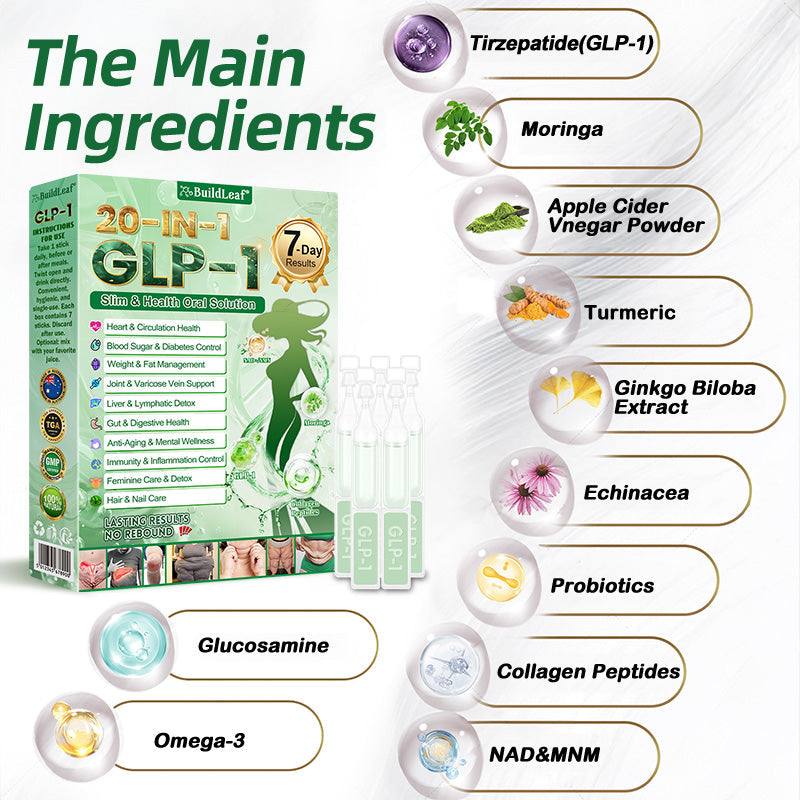 𝘽𝙪𝙞𝙡𝙙𝙇𝙚𝙖𝙛® 𝗚𝗟𝗣-𝟭 𝟐𝟎-𝗶𝗻-𝟭 𝗦𝗹𝗶𝗺 & 𝑯𝒆𝒂𝒍𝒕𝒉 𝑶𝒓𝒂𝒍 𝑺𝒐𝒍𝒖𝒕𝒊𝒐𝒏 was developed by a team of over 30 experts in international endocrinology and diabetology after more than 3 years of research. It combines Tirzepatidewith powerful herbal ingredients to boost metabolism, accelerate fat burning, and support digestive and lymphatic health. To further support the body during weight loss, the formula also includes Collagen Peptides, which stimulate the body’s collagen synthesis to enhance skin firmness, improve sagging and fine lines, and help reduce skin laxity caused by rapid weight loss. This oral solution has been approved by the Australian Therapeutic Goods Administration (TGA) for its safety and efficacy, providing a clinically validated approach to weight loss and whole-body health.